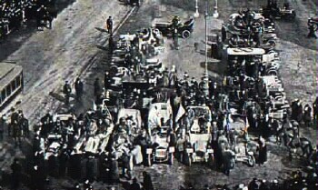 1908, off and running from TIMES SQUARE, the first NEW YORK to PARIS automobile road race, via the BERING STRAIT, began its 88 days of torturous driving. Racer GEORGE SCHUSTER finished first.